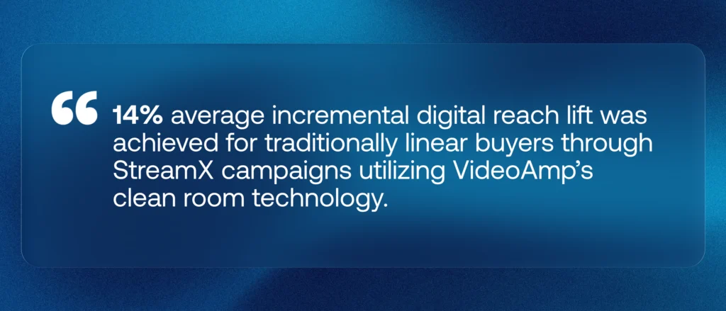 Go beyond impressions and media metrics. VideoAmp’s clean room technology enables traditionally linear buyers to discover new incremental reach opportunities in digital channels, connecting media spend directly to business growth. Advanced planning and analytics tools can tie campaigns to business campaigns like sales lift, brand consideration or site visits—that’s where true campaign value becomes visible.